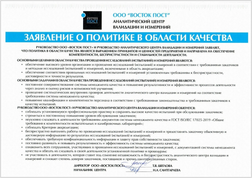 Высокое качество оказываемых услуг обеспечивается высокой квалификацией персонала, наличием парка современного измерительного оборудования, постоянным обучением сотрудников. ООО «ВОСТОК ПОСТ» оказывает техническую и консультационную поддержку заказчиков, в том числе и в нормативно-правовых вопросах.