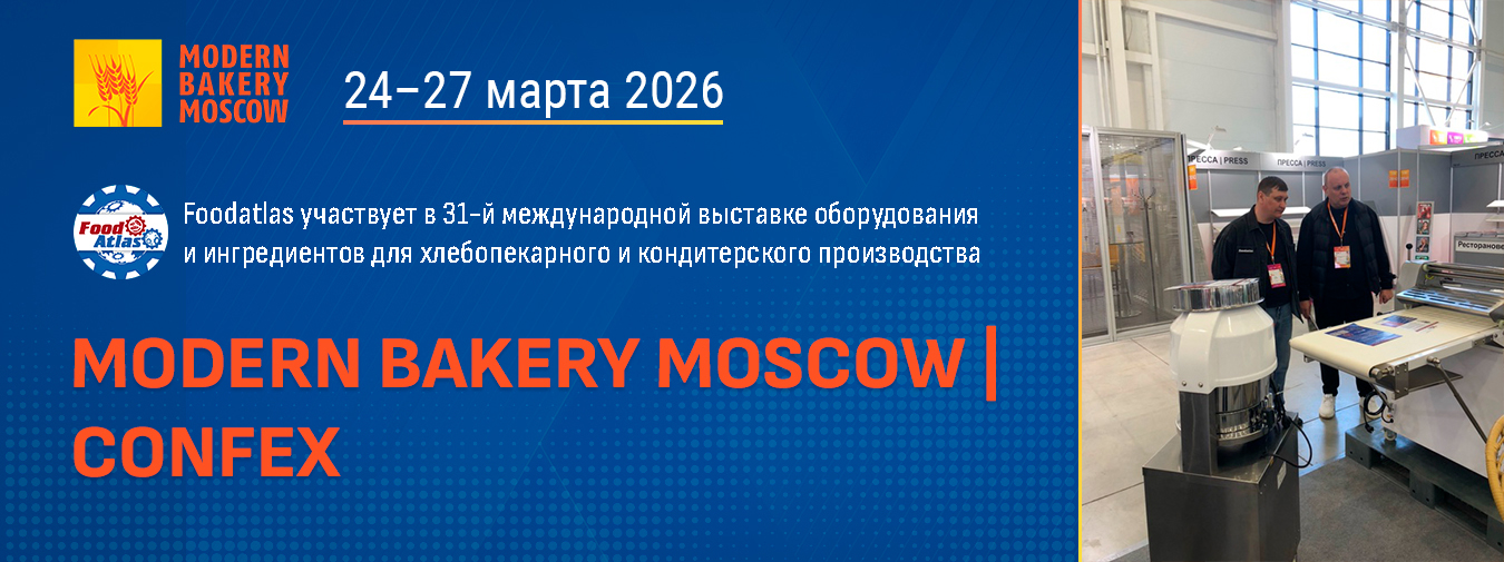 Компания Foodatlas представила новинки оборудования для пекарен и кондитерских в первый день выставки Modern Bakery | Confex 2026. На стенде — тестомесы, печи, пельменный аппарат и другая техника. Мероприятие продолжается до 27 марта.