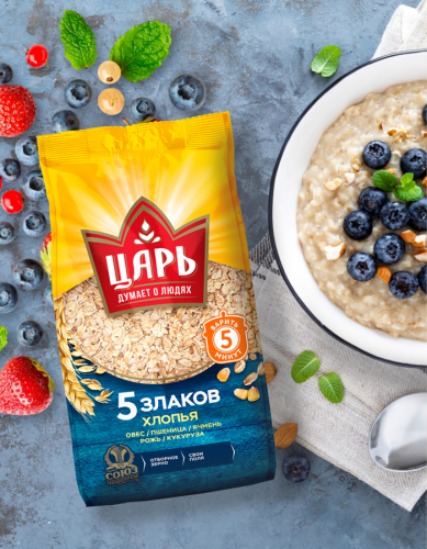 Хлопья "Царь" 5 злаков " состоят из овса, пшеницы, ячменя, ржи, кукурузы