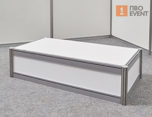 Деревянные подиумы, ковровые покрытия (цвет по запросу), тумбы-подиумы.