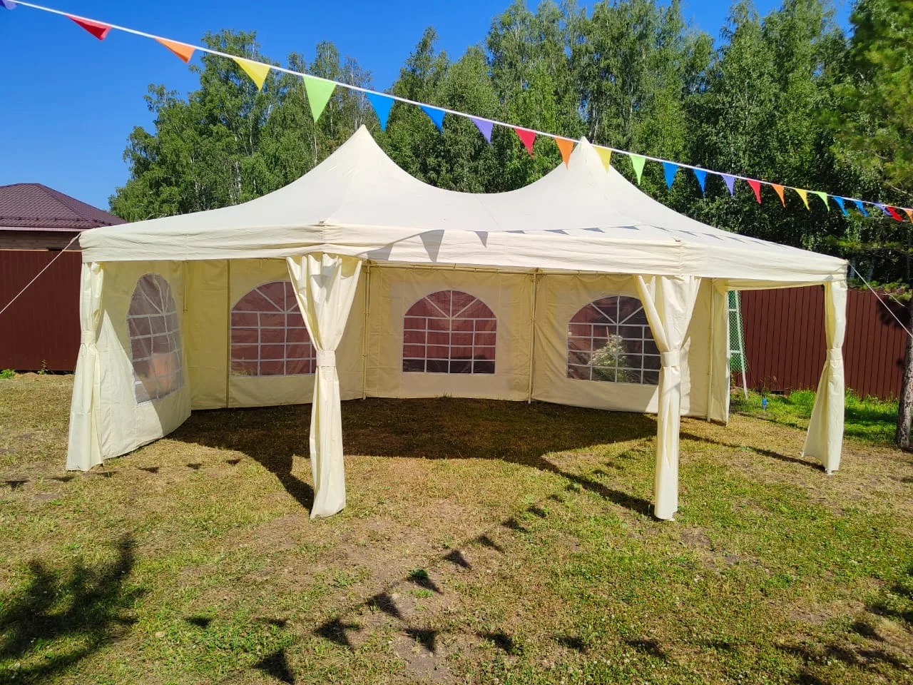 Светлый оттенок шатра визуально расширяет пространство, дарит ощущение уюта и гармонично вписывается в любой ландшафт. Вы можете дополнить его декором практически любых цветов: от нежной пастели до ярких акцентов — шатер станет изюминкой вашего торжества.