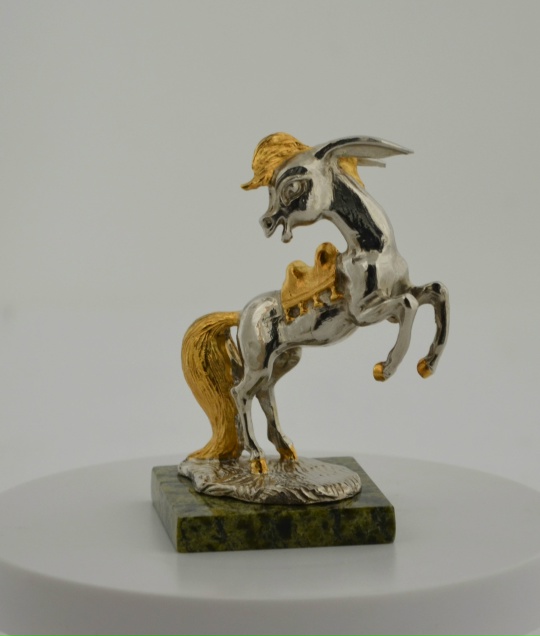 Эксклюзивный настольный сувенир, вдохновленный сказкой П. Ершова. Авторская работа, сочетающая в себе мощь натурального камня и изящество ювелирного литья. Идеальный подарок, символизирующий культурное наследие Сибири. Характеристики - Материалы: Бронза, Золото, Никель - Камень: Змеевик (основание), Долерит - Размер: Высота 97 мм - Техники: Золочение, никелирование, ручная гравировка (иглой и резцом), травление, ювелирная инкрустация камней.