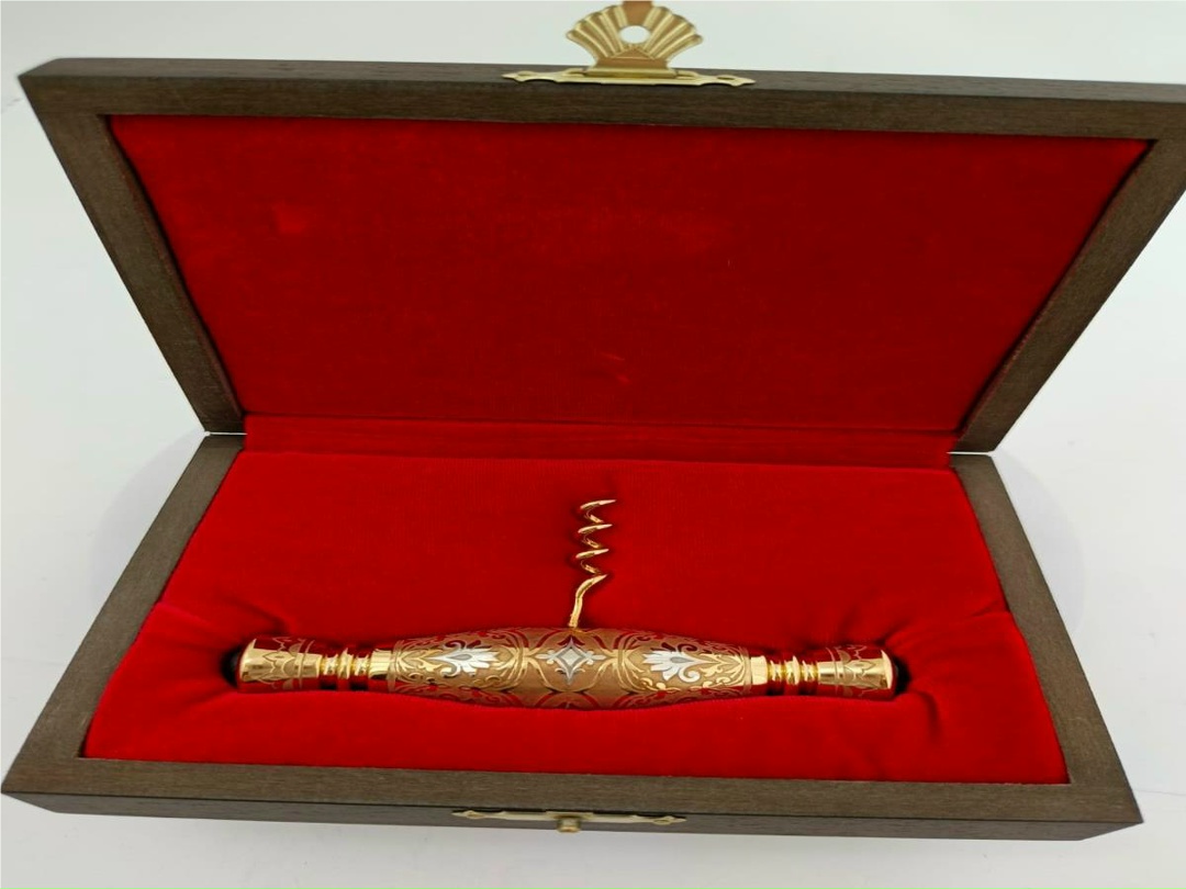 Штопор выполнен в технике Златоустовской гравюры на металле. Орнамент нарисован, выгравирован вручную и дополнен кабошонами агата.