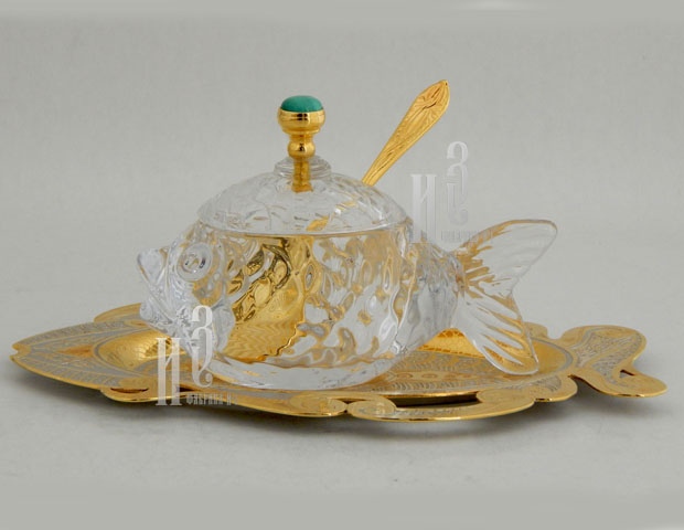 Чаша из хрустального стекла в форме рыбки установлена на поднос, выполненный в форме сказочной рыбы. Крышку украшает золотая ручка с кабошоном натурального малахита.
