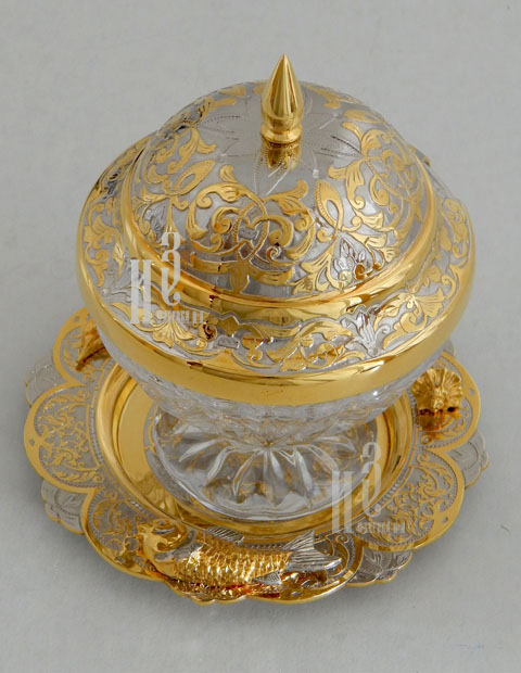Чаша хрустальная установлена на тарелочке, украшенной восточным орнаментом, ракушками и рыбками в технике художественного литья.