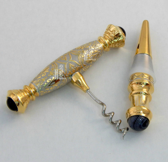 Набор винный (штопор и пробка) выполнен в единственном экземпляре в технике Златоустовской гравюры на металле, покрыт золотом 999 пробы (24 карата). Орнамент нарисован, выгравирован вручную и дополнен ювелирными кабошонами черного агата.