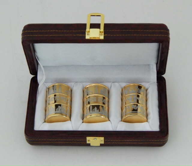Стопки в виде нефтяных баррелей изготовлены из латуни и украшены в технике Златоустовской гравюры на металле. Набор ручной работы станет отличным подарком для мужчины на профессиональный праздник. Материалы: латунь, золото (999).