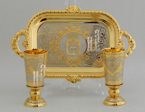 Блюдце и лафиты декорированы в технике Златоустовской гравюры на металле. Рисовка и гравировка выполнены вручную. На рюмки и поднос нанесен герб города Нижний Тагил.